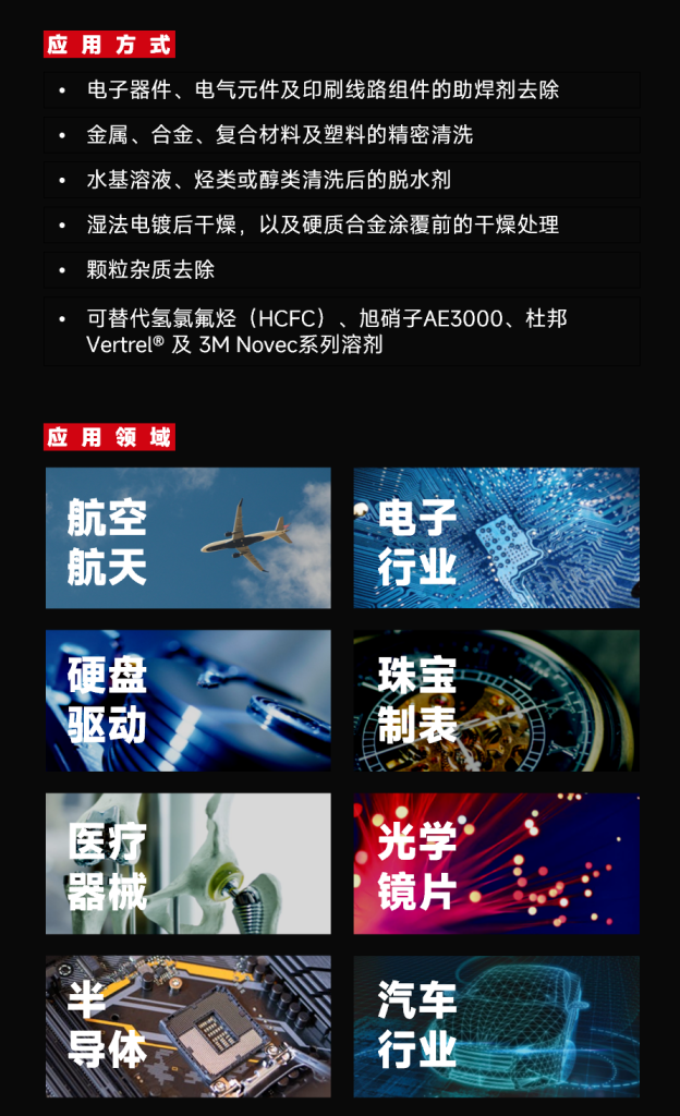 其可替代各类易燃溶剂,也可做为水基清洗工艺的节能型替代方案,具备选择性溶解性能,且粘度低,表面张力低,可形成共沸物。适用于通用清洗及精密清洗场景,可作为冷却介质,亦可充当有机硅及卤代润滑剂的载体